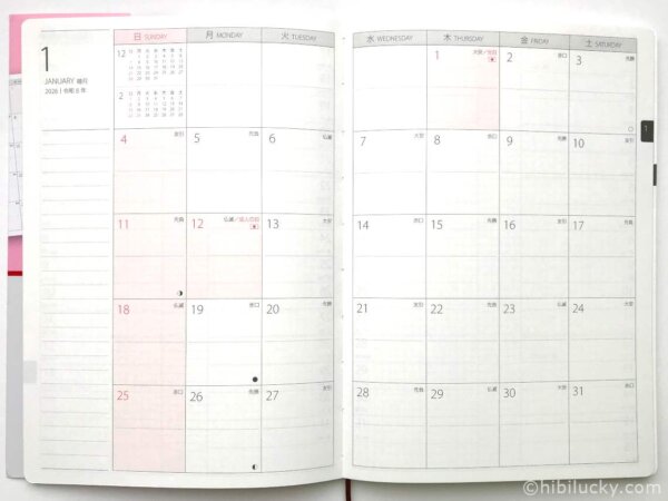 プラチナダイアリーの月間カレンダーの左端の列は3パターンあります。リフィルによって違います。