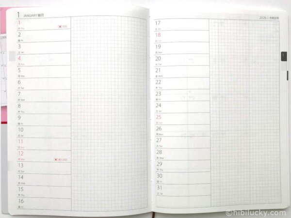 - 月間横ケイ式スケジュール欄は方眼メモスペースあり